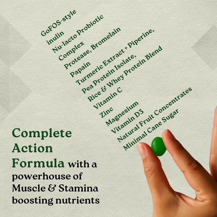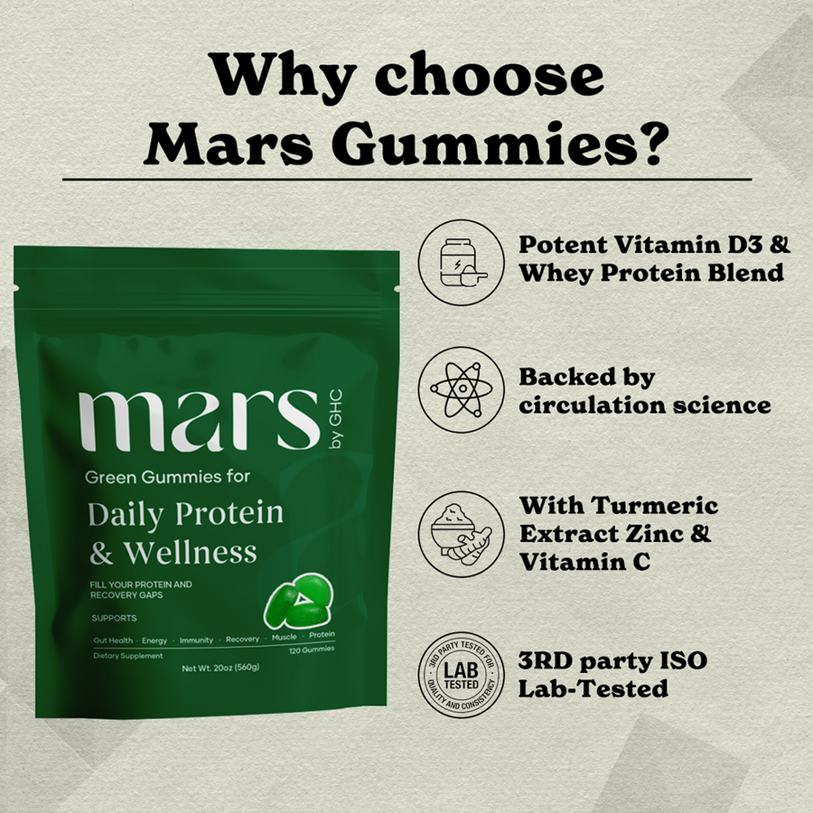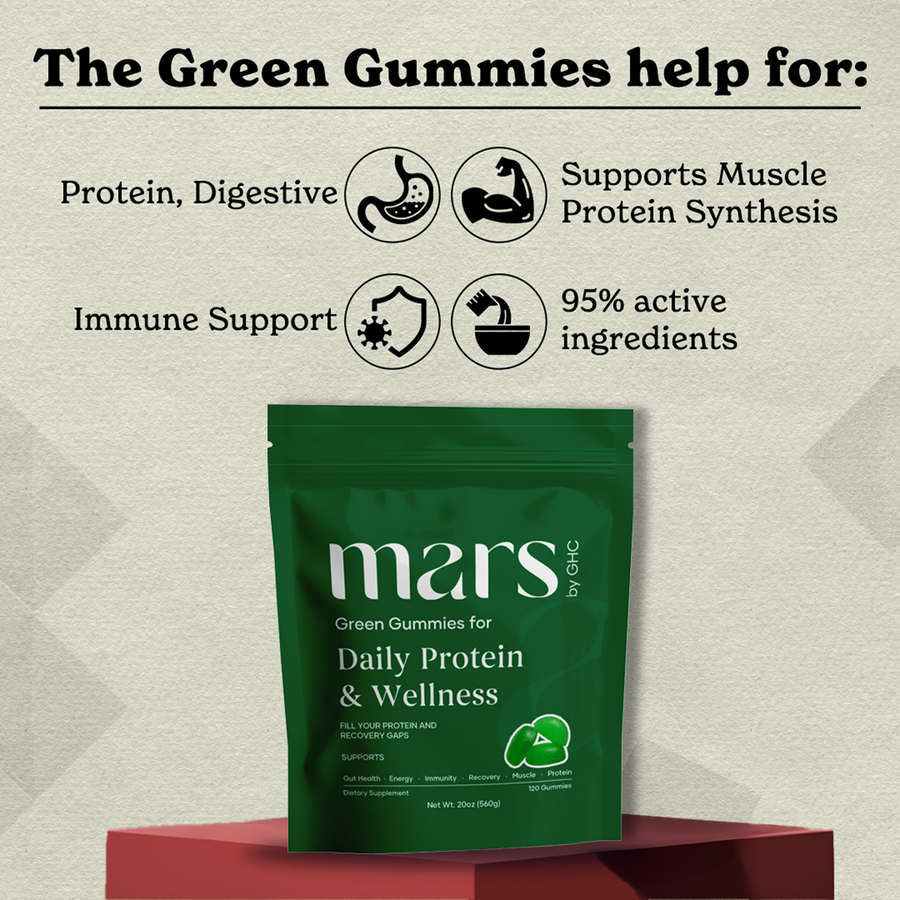 Mars Daily Protein & Wellness Green Gummies support protein intake, digestion, recovery, and immunity cold-processed with 95% active, natural ingredients and no excess sugar or artificial colors.