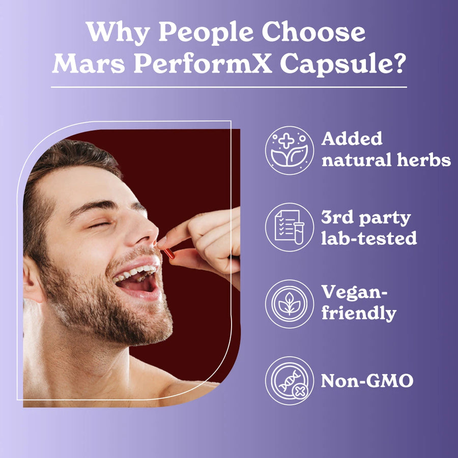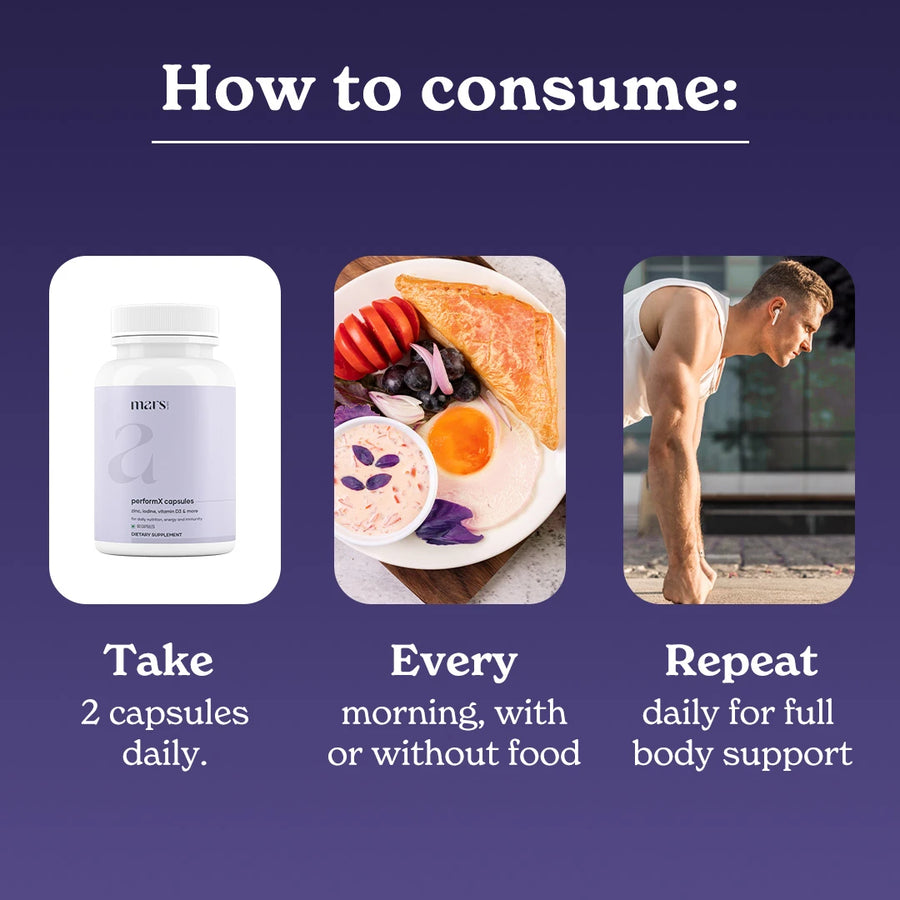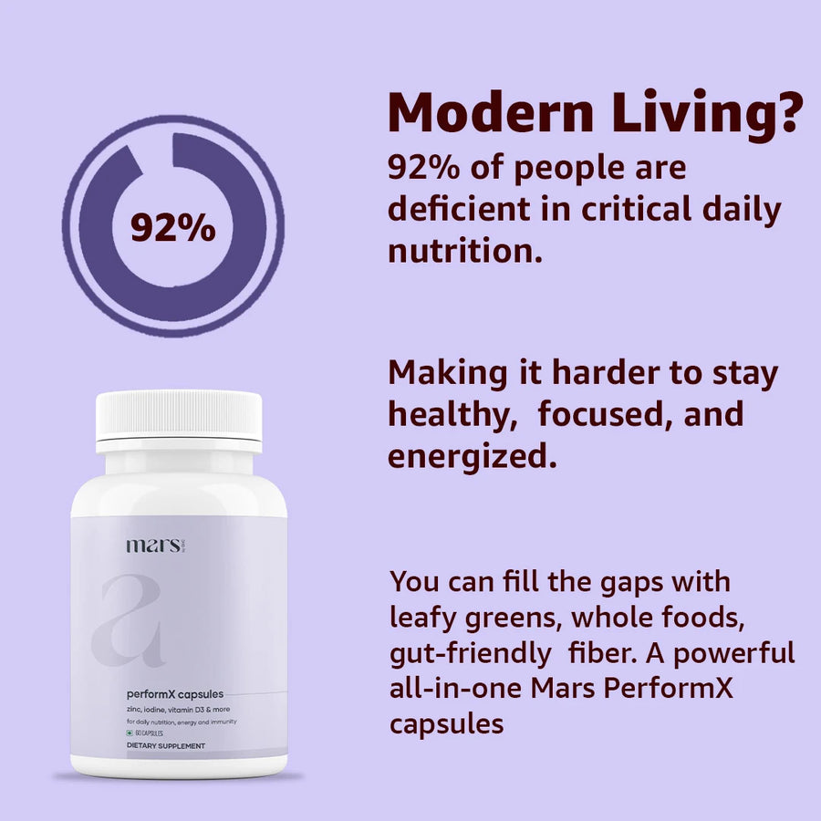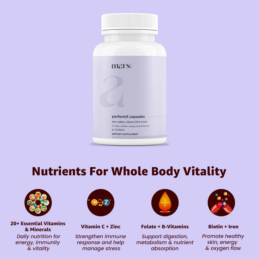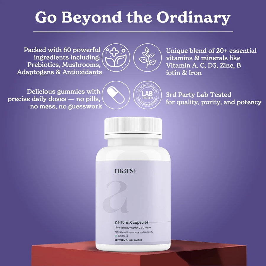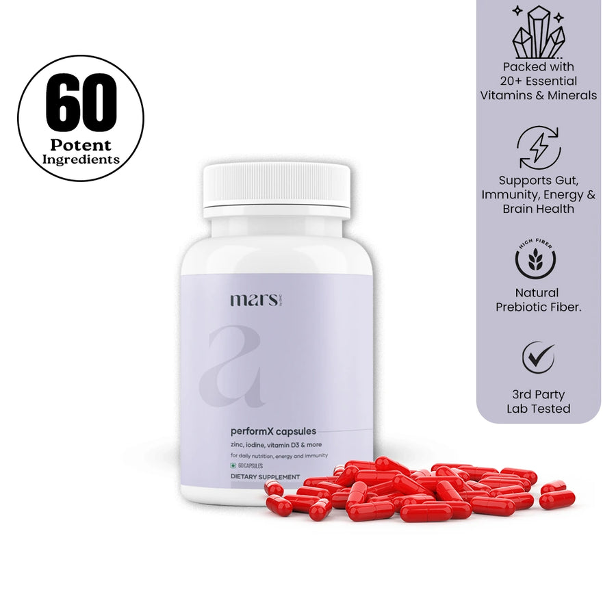 Mars PerformX is an easy-to-consume capsule and powerful daily multivitamin formulated with 60 potent ingredients, including 20+ essential vitamins and minerals. From gut and immune support to energy, focus, and skin health, this all-in-one formula helps bridge nutritional gaps caused by modern lifestyles.