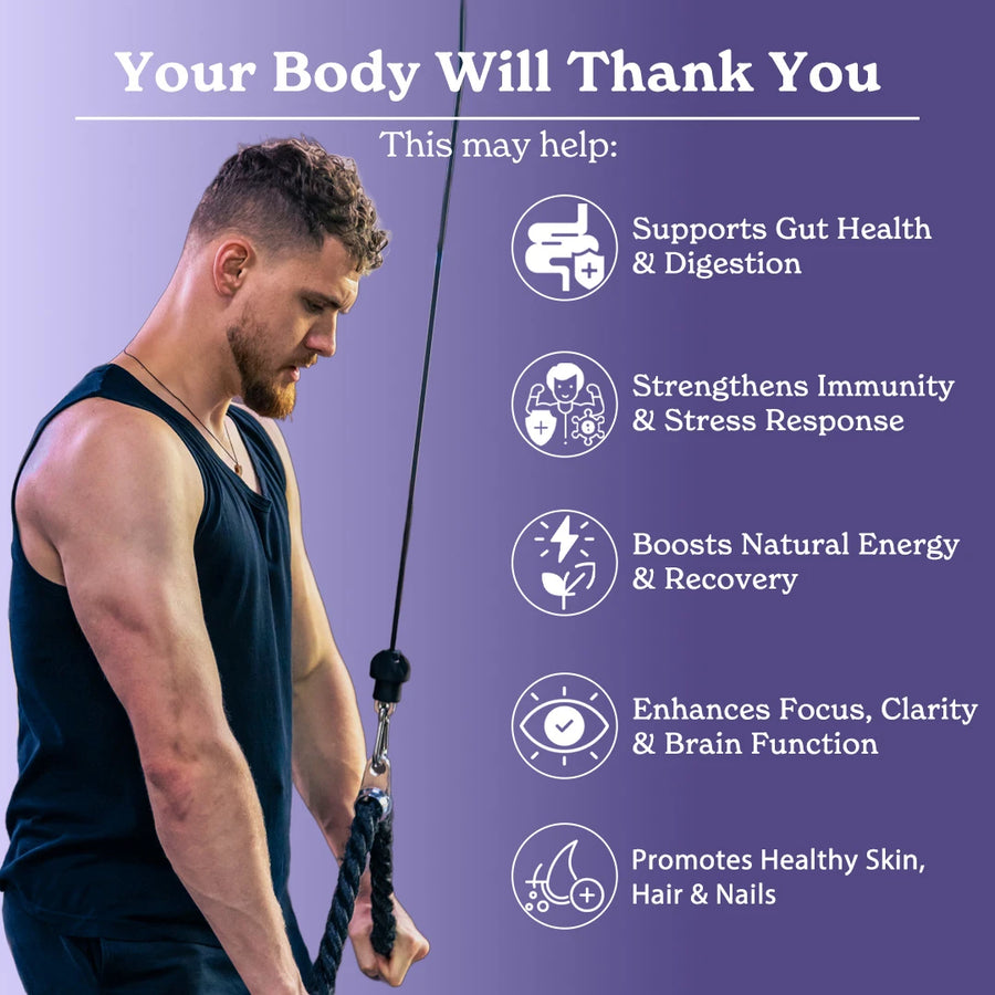 • Strengthens immunity and helps manage stress with adaptogens and antioxidants