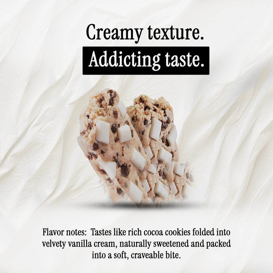 The combination of cookie, cream, and whey proteins gives it a smooth, indulgent bite.