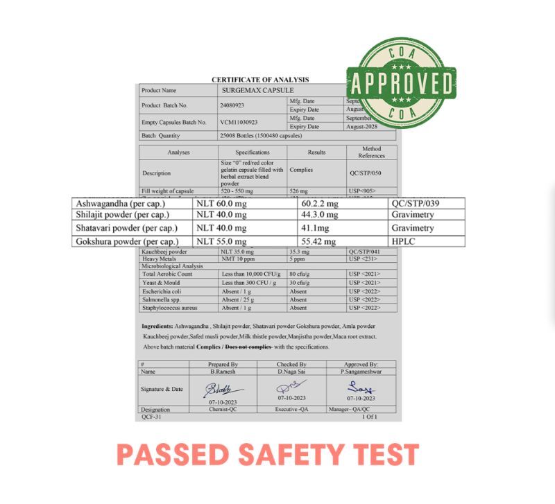 Crafted from natural elements like Ashwagandha, Shilajit, Safed Musli, Gokshura, and Shatavari, our formulation may have zero side effects.